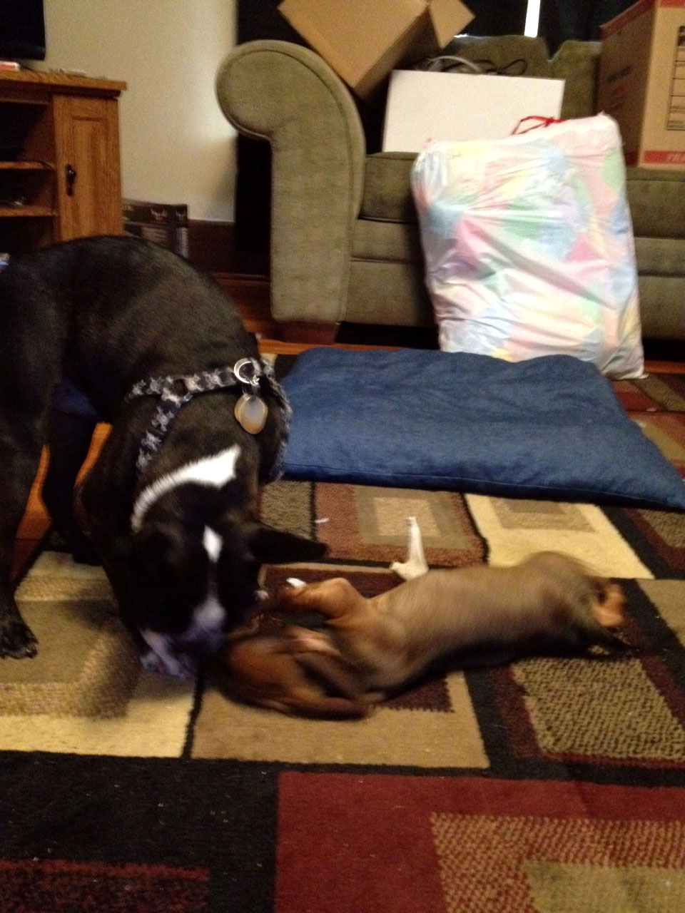 Batman and Dexter are absolutely best friends! I get nervous sometimes because they play rough, but they love each other. Dexter was being loud and destructive the other night, so I put him downstairs with Alex while Batman and I went upstairs to sleep. Batman sat by the bedroom door and whined. And whined. And whined. He hates being away from Dexter.